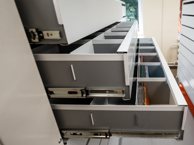 Металлические стеллажи с выдвижными ящиками могут использоваться в разных отраслях.