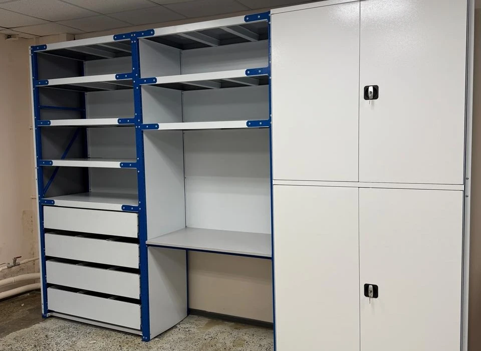 Металлический стеллаж можно оборудовать ящиками и дверями для защиты содержимого от пыли и повреждений. Рабочий стол, расположенный в нижней части стеллажа, позволяет удобно организовать рабочее пространство и обеспечивает быстрый доступ к нужным инструментам.