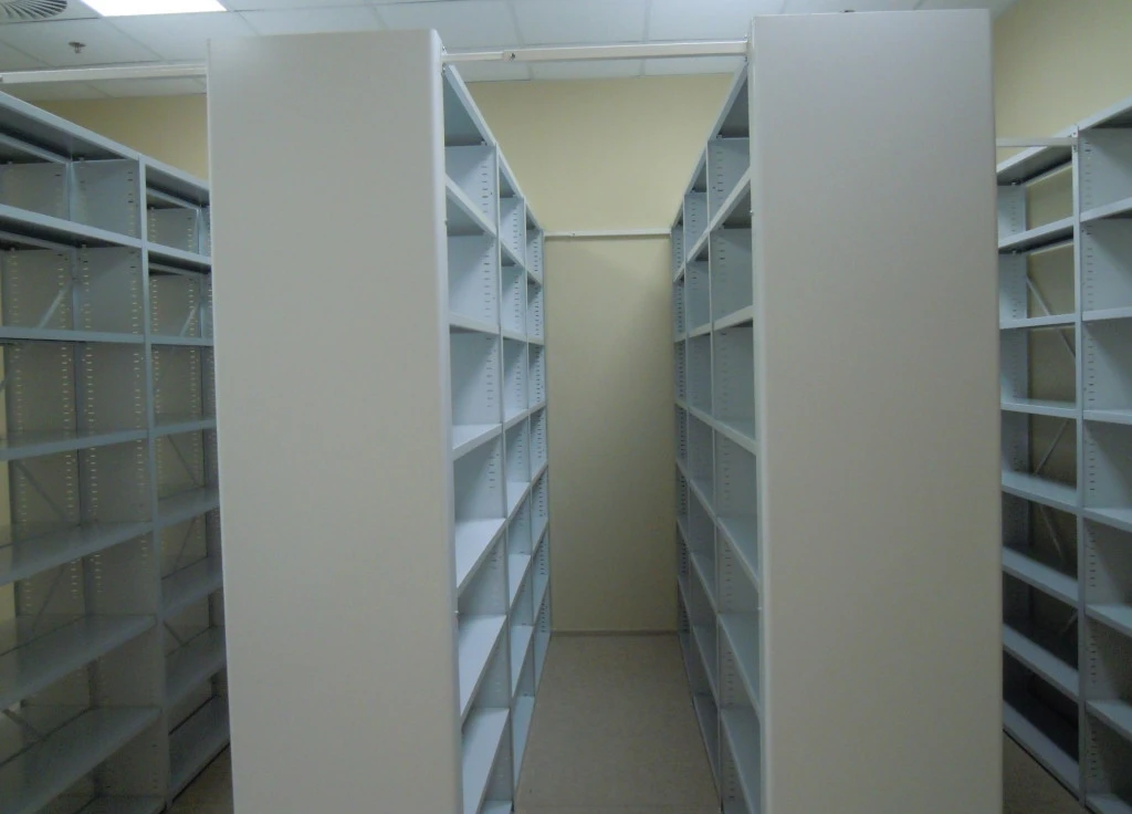 Системы компактного архивного хранения документов. Вдвое повышается вместимость или сокращаются занимаемые площади. Используются двухсторонние передвижные стеллажи для архивохранилища.